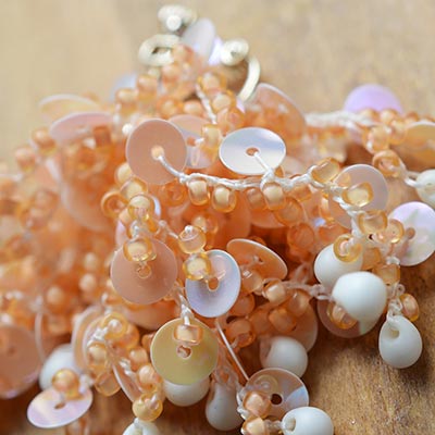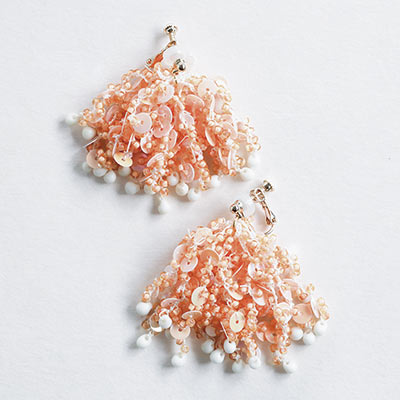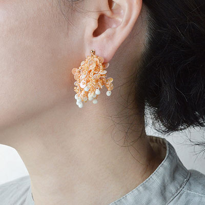 海中でゆれるサンゴのようなデザインの、イヤリングキット。糸がベースになっているので、ほどよいボリューム感がありながらも、軽やかなつけ心地なのが嬉しいポイント。マットな中染めのオレンジに同系色のスパンコールを合わせた、肌なじみのよいカラー。