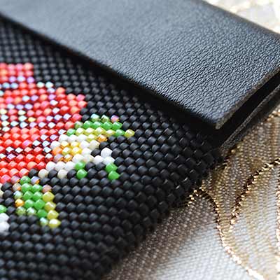 しっとりとした落ち着きのある花模様、薔薇とマーガレットをビーズでデザインしました。ベースカラーを甘すぎない黒で引きしめ、刺しゅう模様にも似た花柄が上品でフェミニンな印象です。ケースの向きが横型なので、カードの向きを変えずに収納できます。