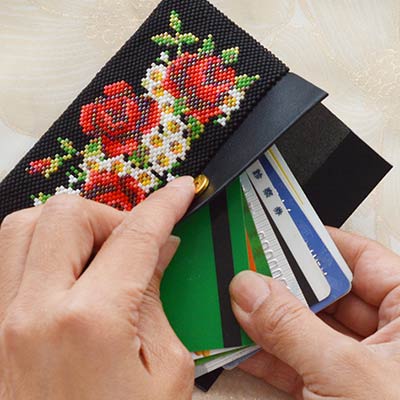大切なカードだからこそ…、1粒1粒心を込めて作った思い入れのあるカードケースで保管しませんか?蓋部分はマグネットホックでしっかり留まり開け口も広げられるので、マイナカードなどの大切なカードも大切に保管・すぐに出せて便利!お財布に入りきらずあふれてしまったカードもすっきり収納。7〜8枚くらいまでまとめて入れられます。