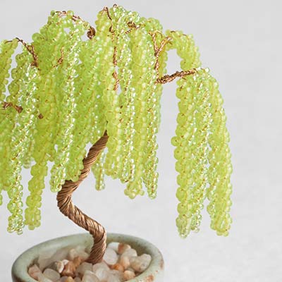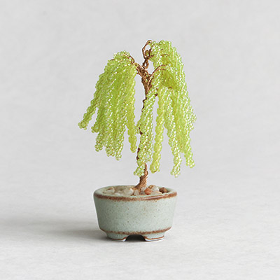 風に揺れる細枝が美しい柳は、しなやかさや美の象徴とも言われます。粒の小さなビーズを用いることで、繊細な動きや輝きを表現しています。