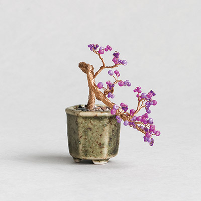 小さな実を房状につける紫式部は、気品や豊穣の象徴とも言われます。色鮮やかな実を、大きさや質感の異なる様々な紫のビーズで表現しています。