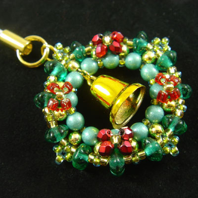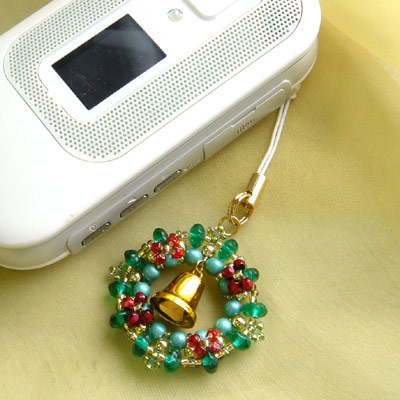 お花模様の付いた、可愛いミニリースが出来上がりました!ケータイに付けてもプレゼントに飾ってもクリスマスムードばっちりです。真ん中の鈴が、可愛らしいでしょ♪