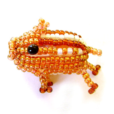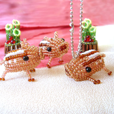 両端のテグスを、体パーツの7列目と13列目のビーズに通した後、片方のテグスに新たなビーズを通して引きしめる。終わりは、4)と同様にテグスの始末をして出来上がり。