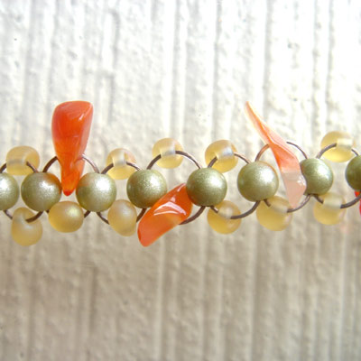 ドロップ、サザレを入れながら、ラッカーパールで交差させて編んでいく。
