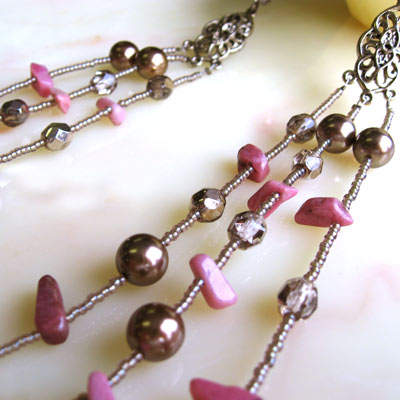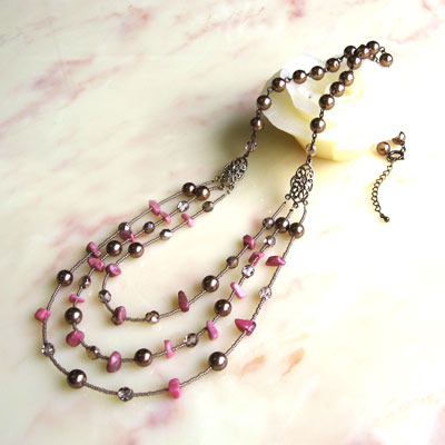 愛と思いやりの象徴と言われる石、ロードナイト。ギリシャ語で「バラ」の意味からつけられたそうです。その名の通りの美しいピンク色をパールやファイアポリッシュでまとめ、ボリュームのある3連ネックレスに仕上げました。ロードナイトとの力とネックレスのデザインで、一気に女性らしさをアップしてみませんか?