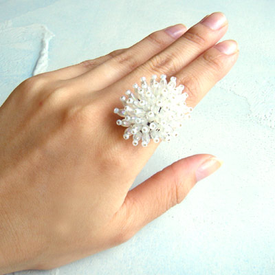 しゃぼん玉のようにキラキラしたスキレインボーパールのライス型を使ったリングです。シャワー金具の穴にパールとビーズをとめ付けていくだけの簡単レシピです。おしゃれのワンポイントにどうぞ。