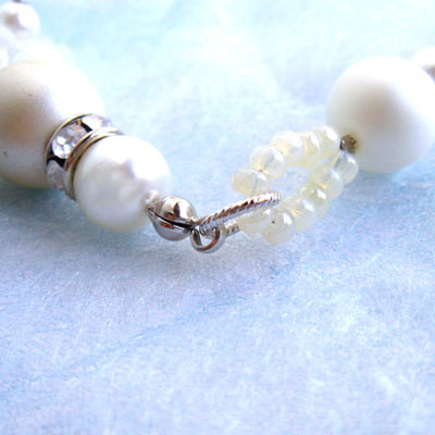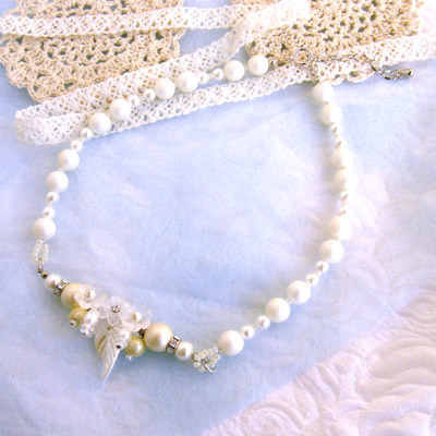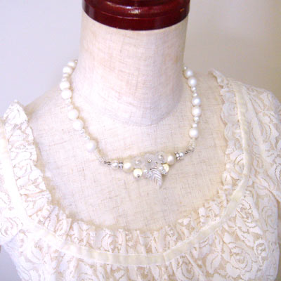 ファッションパーツの端の丸リングをスタートに、ナイロンコートワイヤー(60cmに切る)を通し、 図の様にビーズを通す。もう片方も同様に通す。