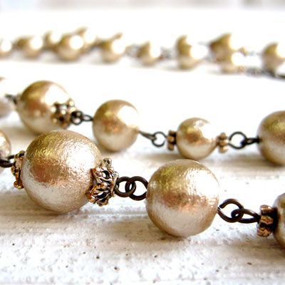 今話題のコットンパールをアイピンでつないだ2WAYネックレスです。1連のロングタイプと2連のショートタイプの2通りの使い方ができます。他のパールやアクリルビーズで作った同じタイプのネックレスに比べて、とても軽い仕上がりですので、一度この軽さを体験してみて下さい。