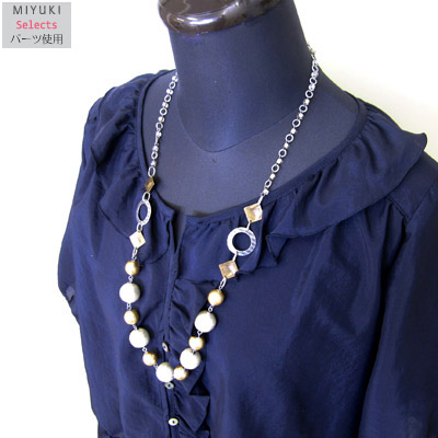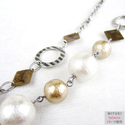 大粒のコットンパール2色使いの程よいボリュームのネックレスです。メノーニ メタルパーツと組み合わせて高級感をプラス♪落ち着いたカラーでこれからの季節にぴったりですよ。