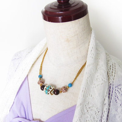 ターコイズカラーのティラビーズとウッドビーズ15mmをぐるりと1周したパーツが個性的なデザイン☆中心のビーズボールを作ってしまえば、後はビーズ・パーツを通して出来ちゃう季節感たっぷりのネックレスです。カジュアルな装いに、Tシャツにさらりと合わせ易いですよ。
