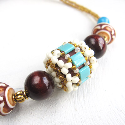 新たにテグスを60cmx1本に切り、1)のモチーフ2枚の◎部分の丸大ビーズをすくいながら編み、 6コ目のティラビーズを入れた辺りでウッドビーズ(H475)を中に入れ、ウッドビーズを包む様に残 りのビーズを編んでいく。テグスを引き締め、残りのテグスを始末する。
