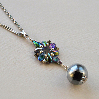 ドロップデュオビーズなどで作った小さなモチーフとモノトーンのチェック柄がシックで可愛いチェッカーパールのペンダントのご紹介です。モチーフのドロップデュオビーズとスワロフスキー・クリスタルの輝きで小さくても存在感のあるペンダントトップです。