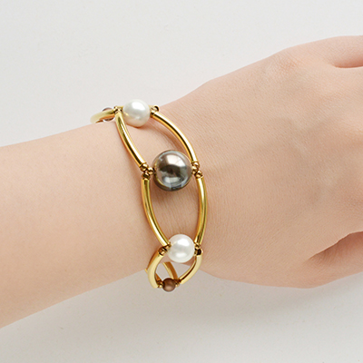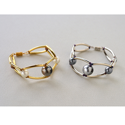 チェッカーパールをアクセントにした存在感のあるブレスレットです。パール・ビーズ・ステーションパーツを交差編みして作ります。留め具には脱着が簡単なマグネットクラスプを使用しており、ボリュームがあるデザインですが、とても軽い着け心地です。