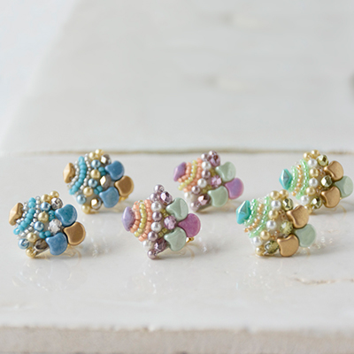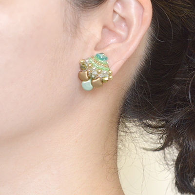 様々な形のビーズをテグス編みと刺繍でミックスして作る、お魚の形をしたイヤリングです。大きめモチーフイヤリングは、夏コーディネートに華やかさをプラスしてくれます。緑のお魚イヤリングで夏の暑い日も涼やかで、華やかな印象に。