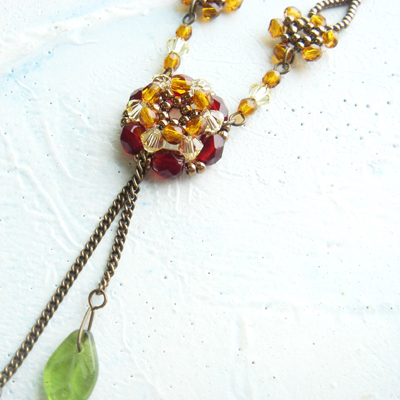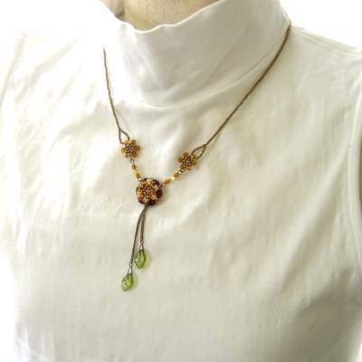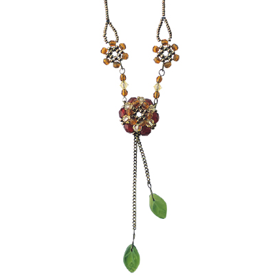 大小の花モチーフと揺れるリーフがポイントの少し長めのネックレスです。