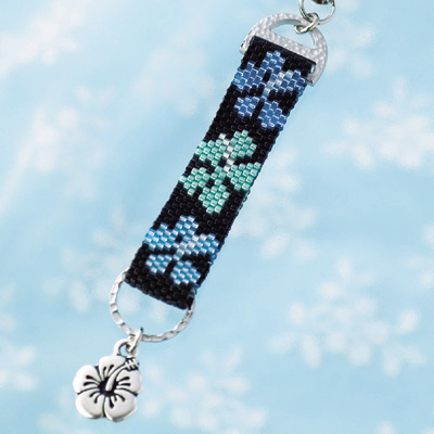 黒地に青く輝くビーズが美しい、大人っぽいハイビスカスのストラップです。ハイビスカスのチャームで高級感のあるストラップに仕上げてみました。「色違い情報」を説明書の中で紹介しています。参考作品の色違い2点も是非お楽しみ下さい。