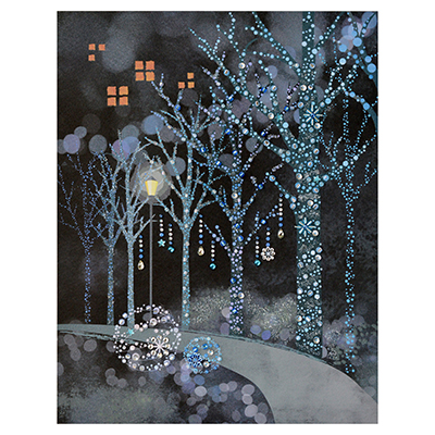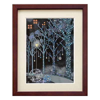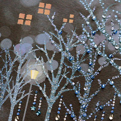 青く輝くイルミネーションの光を、キラキラ輝くビーズやグリッター、様々なアクリルストーンやラインストーンで表現しました。背景のコントラストがビーズやパーツを色鮮やかに引き立ててくれます。