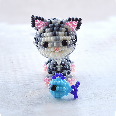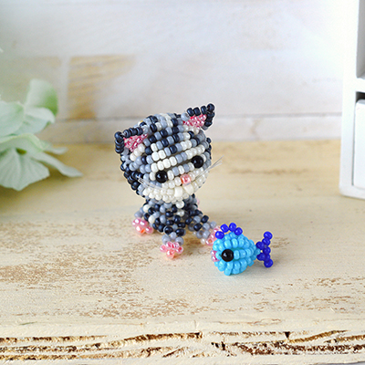 ビーズ&テグスで作れる部屋置きのねこマスコットです。頭でっかちでほぼほぼ2頭身なネコちゃんたちが可愛くて見ているだけで癒されます♪頭はビーズボール、体は交差編みの立体…と小っちゃいボディーに作り込み要素が一杯!お部屋時間を使ってゆっくり作ってみてはいかが?