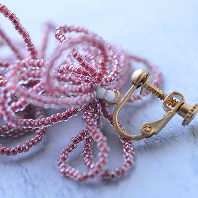 針と糸でつくる、シードビーズのイヤリング。特小ビーズをつなげたいくつものループが、ふわっと空気をふくんだ泡のようで、軸の色合わせがアクセントに。糸にビーズを通すだけなので、難しいテクニックは使わずに、つくることができます。