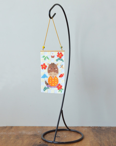こちらのミニタペストリーの飾り部分には6mmのトンボ玉を使用しています。カラーが豊富なトンボ玉はお気に入りの色でのアレンジも楽しめます。