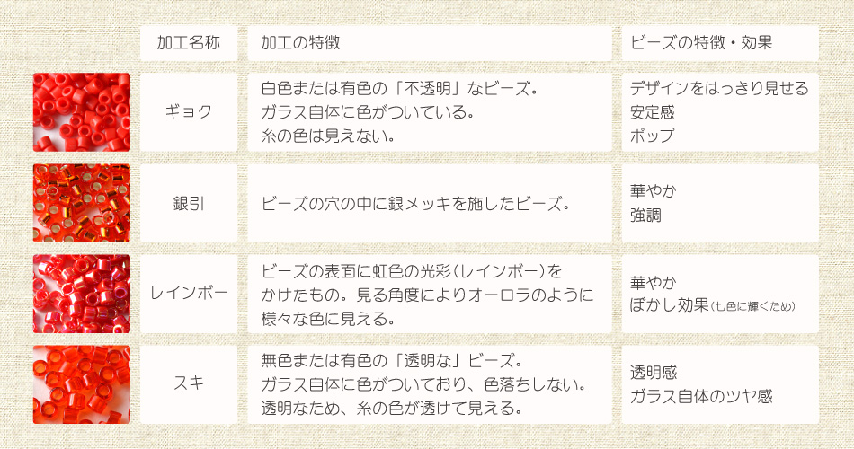 ビーズにはいくつかの加工方法があり、今回は、基本的な加工のうち『ギョク』『銀引』『レインボー』『スキ』が登場します。