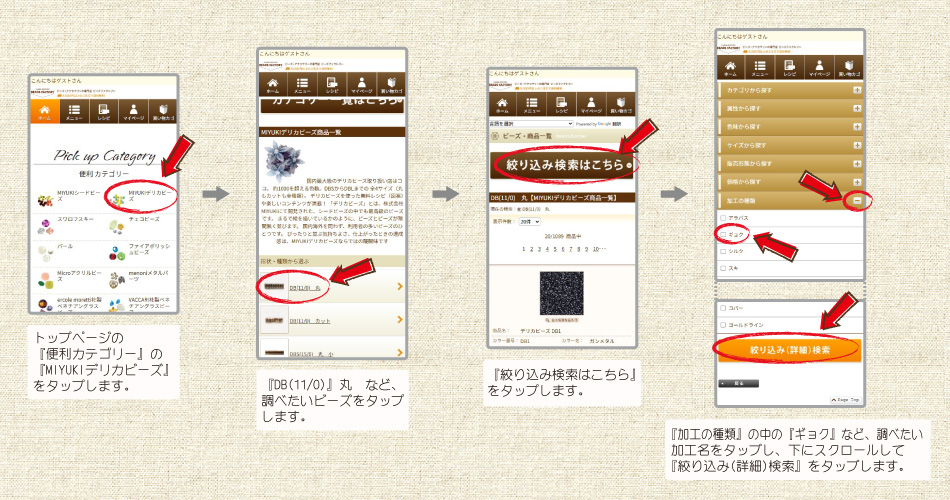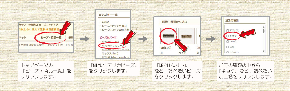 トップページの『ビーズ・商品一覧』から、調べたいビーズの種類や加工など、条件を絞っていくと見つけやすいです。