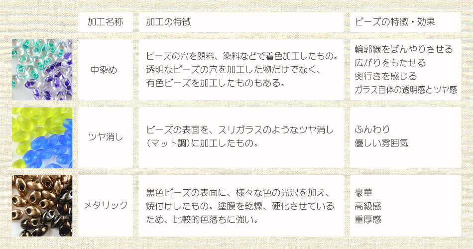 ビーズの加工の内、『中染め』『ツヤ消し』『メタリック』についての【ビーズの加工別の特徴】をご紹介します。