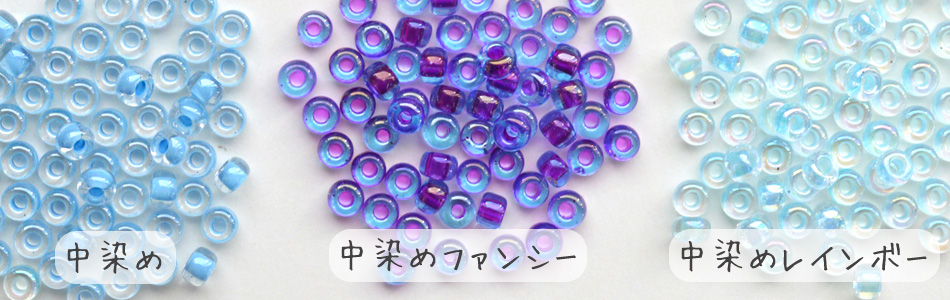 『中染め』には、透明なビーズではなく有色ビーズの穴に着色加工した『中染めファンシー』や、前回ご紹介した『レインボー』の加工も同時に施された『中染めレインボー』もあります。