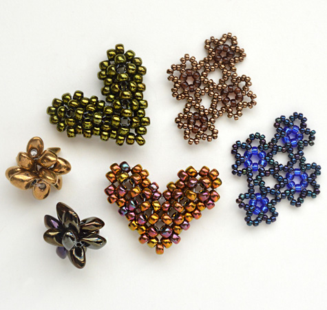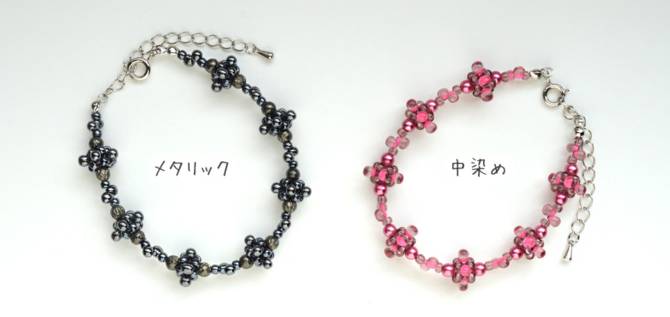 『メタリック』の丸大ビーズと丸小ビーズの色を変えたアレンジ作品と『中染め』・『ツヤ消し』ビーズを使ったアレンジ作品です。お手持ちのお洋服に合わせたり、目指したい雰囲気に合わせて、ビーズ選びをお楽しみください。