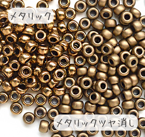 『メタリック』には、『ツヤ消し』の加工も施された『メタリックツヤ消し』もあります。『メタリックツヤ消し』は、高級感がありつつふんわりした印象を演出できるビーズです。