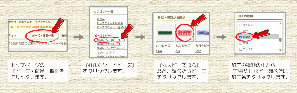 トップページの『ビーズ・商品一覧』から、調べたいビーズの種類や加工など、条件を絞っていくと見つけやすいです。