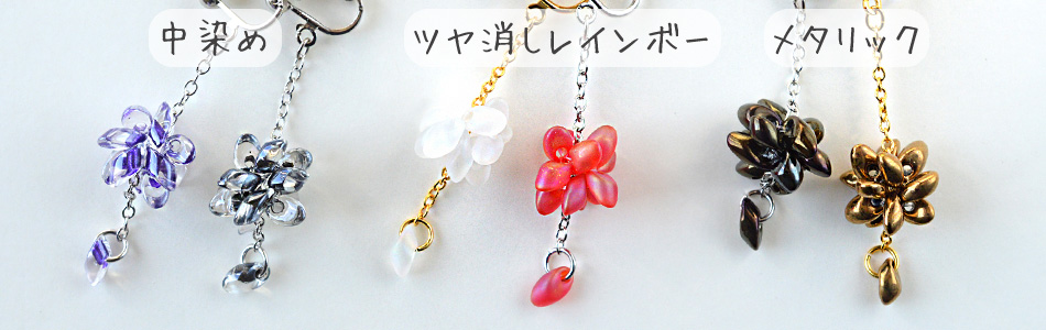 『メタリック』・『中染め』ビーズを使ったアレンジ作品です。ドロップビーズはガラス部分に厚みがあり、『中染め』の場合、ビーズの穴の色とガラスの色の差が美しく、奥行きがあります。貴方らしいオリジナルのビーズ選びにチャレンジしてみてください。
