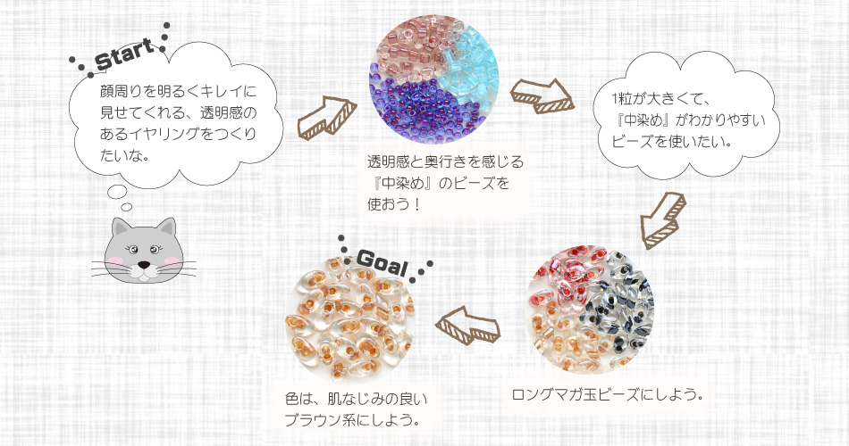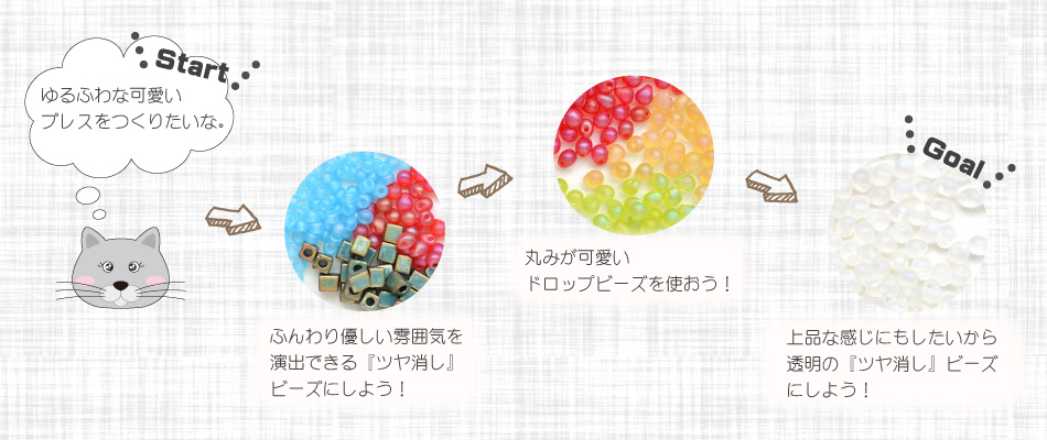 作りたい作品のイメージに沿って、色だけでなく加工も絞り込むとビーズ選びの時間短縮にもつながります。