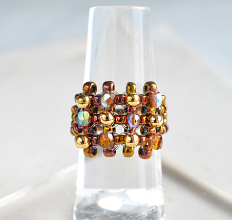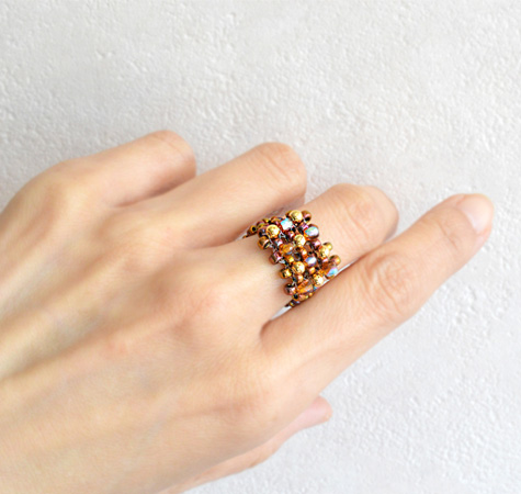 丸大ビーズをテグスで編んだ土台に、ファイアポリッシュビーズと本金メッキパーツを編みこんだ、四角いデザインがスタイリッシュなリングです。『メタリック』のビーズを使うことで、高級感のあるリングになっています。