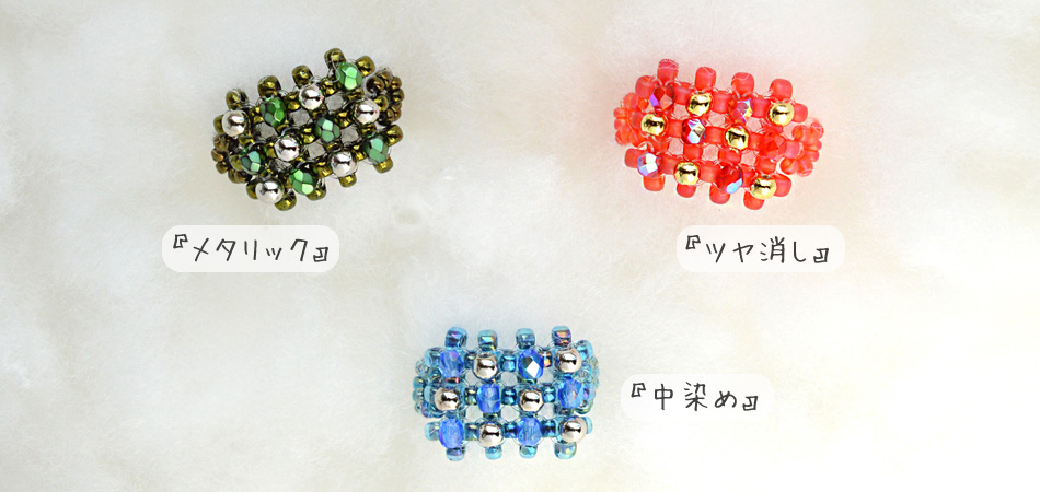 ガラスの色とビーズの穴の色で1粒に2色の色が見える『中染め』やふんわり優しい雰囲気を演出できる『ツヤ消し』、高級感のある『メタリック』と、どんな加工のビーズを選ぶかによって出来上がりの雰囲気が違ってきますので、作品作りの際のビーズ選びのヒントになると嬉しいです。