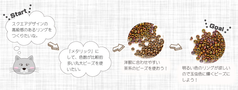 今回は、高級感という作品のイメージだけでなく、スクエアデザインという形まで最初に決まっていたので、ある程度ビーズの大きさがあってテグス編みしやすく色数も多い『メタリック』の丸大ビーズを使用することにしました。ベースとなる丸大ビーズが決まってから、大きさや色が合うファイアポリッシュビーズや本金メッキパーツが決まっていきました。