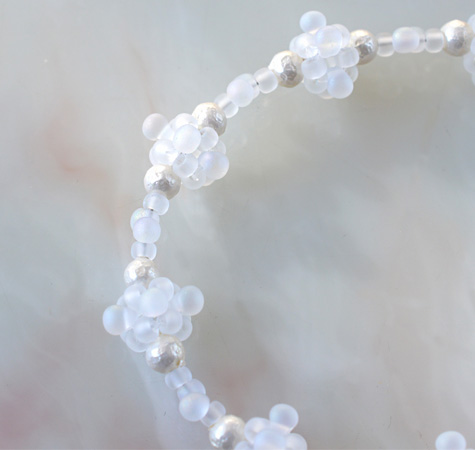『ツヤ消し』のビーズを使った、ふわふわな雪を思わせるようなビーズボールを散りばめた一連のブレスレットです。ビーズボールの両端に添えたシュリンクパールの控えめな輝きが、上品さをプラスしてくれています。